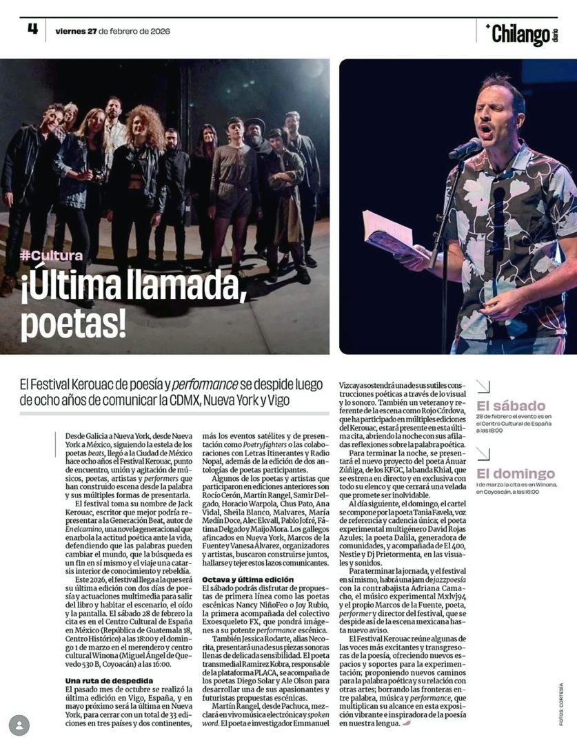 El Festival Kerouac se despide tras ocho años de agitar la escena poética de México y comunicarla con USA y España, a través de sus sedes en Vigo y Nueva York. Hasta allí, Rocío Cerón, Martín Rangel o Samir Delgado cruzaron el puente para unir e inspirar desde México. Chus Pato, Ana Vidal, Sheila Blanco, Malvares, María Medín Doce, Alec Ekvall, Pablo Jofré, Fátima Delgado o Maijo Mora, llegaron a Ciudad de México para mostrar su poesía, en gallego, catalán, español e inglés, desde Europa, y desde Nueva York. Los gallegos afincados en Nueva York, Marcos de la Fuente y Vanesa Álvarez, organizadores y artistas, poetas que quieren estar con otros poetas, construirse juntos, hallarse, tejer la presencia.