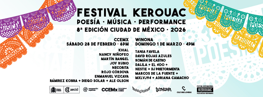 Este año, el sábado en el CCEMx, podremos disfrutar de propuestas de primera linea como las poetas escénicas NancyNiñofeo o Joy Rubio, la primera acompañada del colectivo Exoesqueleto FX, que pondrá imágenes a su potente performance escénica. También Jessica Rodarte, alias Necorita, presentará una de sus piezas sonoras llenas de delicada sensibilidad. El poeta transmedial Ramirez Kobra, también responsable de la plataforma PLACA, se acompaña de los poetas Diego Solar y Ale Olson, para desarrollar una de sus apasionantes y futuristas propuestas escénicas. Martín Rangel, desde Pachuca, mezclará en vivo música electrónica y spoken word. El poeta e investigador Emmanuel Vizcaya sostendrá una de sus sutiles construcciones poéticas a través de lo visual y lo sonoro. También un veterano y referente de la escena como Rojo Córdova, que ha participado en múltiples ediciones del Keroiuac, estará presente en esta última cita, abriendo la noche con sus afilada s reflexiones sobe la palabra poética. Para terminar la noche, se presentará el nuevo proyecto del poeta Ánuar Zuñiga, de los KFGC, la banda Khial, que se estrenaen directo y en exclusiva con todo su elenco y que cerrará una velada en el CCEMx que promete ser emocionante e inolvidable.